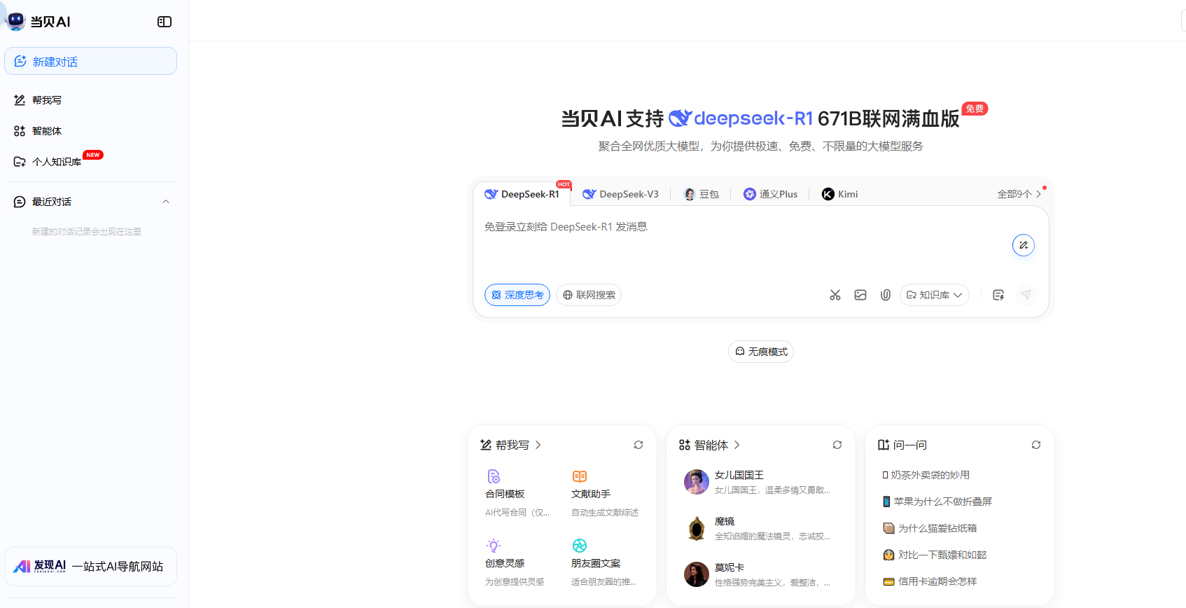 当贝 AI combines powerful language models like DeepSeek-R1 and DeepSeek V3 to deliver instant writing assistance. This no-login-required platform helps users generate documents, research papers, and creative content with remarkable efficiency.