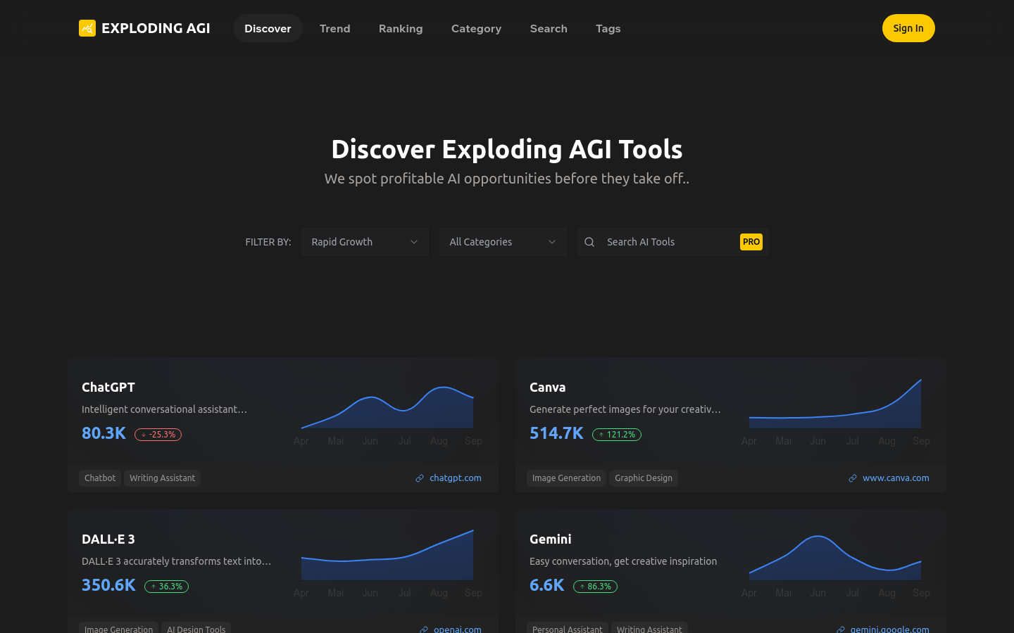 Exploding AGI is a platform dedicated to discovering AI tools and opportunities, aimed at helping users identify and leverage profitable opportunities within AI technology. The platform offers a variety of AI tool categories and trend analyses, including chatbots, AI design tools, image generation, translation, and writing assistants. By providing detailed product descriptions, user reviews, and market trend analyses, it aids users in discovering and comparing different AI tools to enhance work efficiency and innovation.
