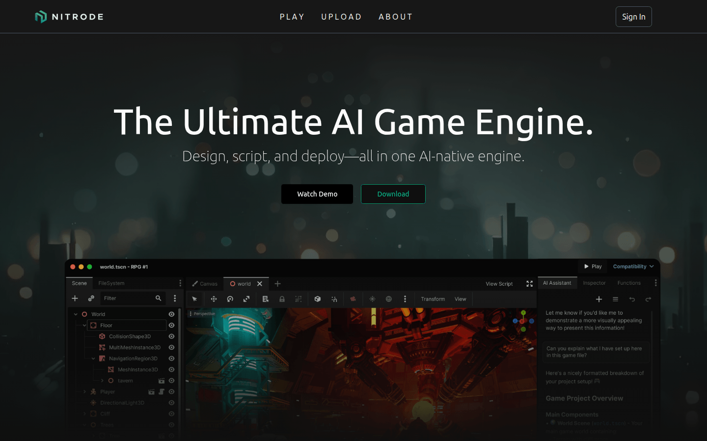 Nitrode is a cutting-edge AI-native game engine designed to simplify game development. It allows developers to create game mechanics by connecting nodes, generate assets using AI, and build games without the need for boilerplate code. This engine is perfect for those who want to focus on design rather than technical complexities.