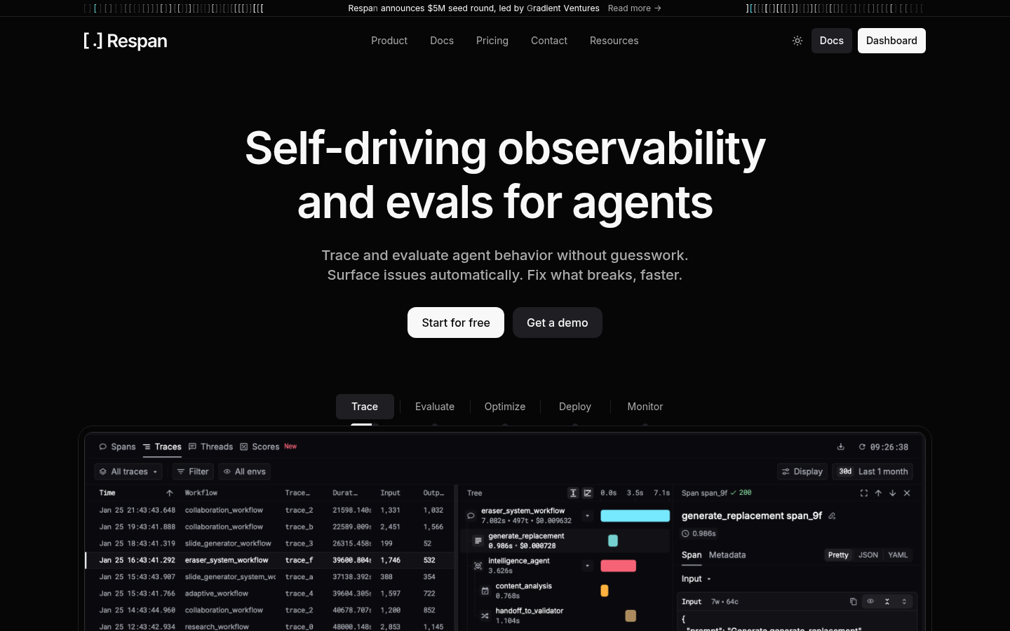 Respan records every detail of your LLM interactions - prompts, tool calls, responses - with full context from actual production traffic. It's like having DVR playback for your AI operations: