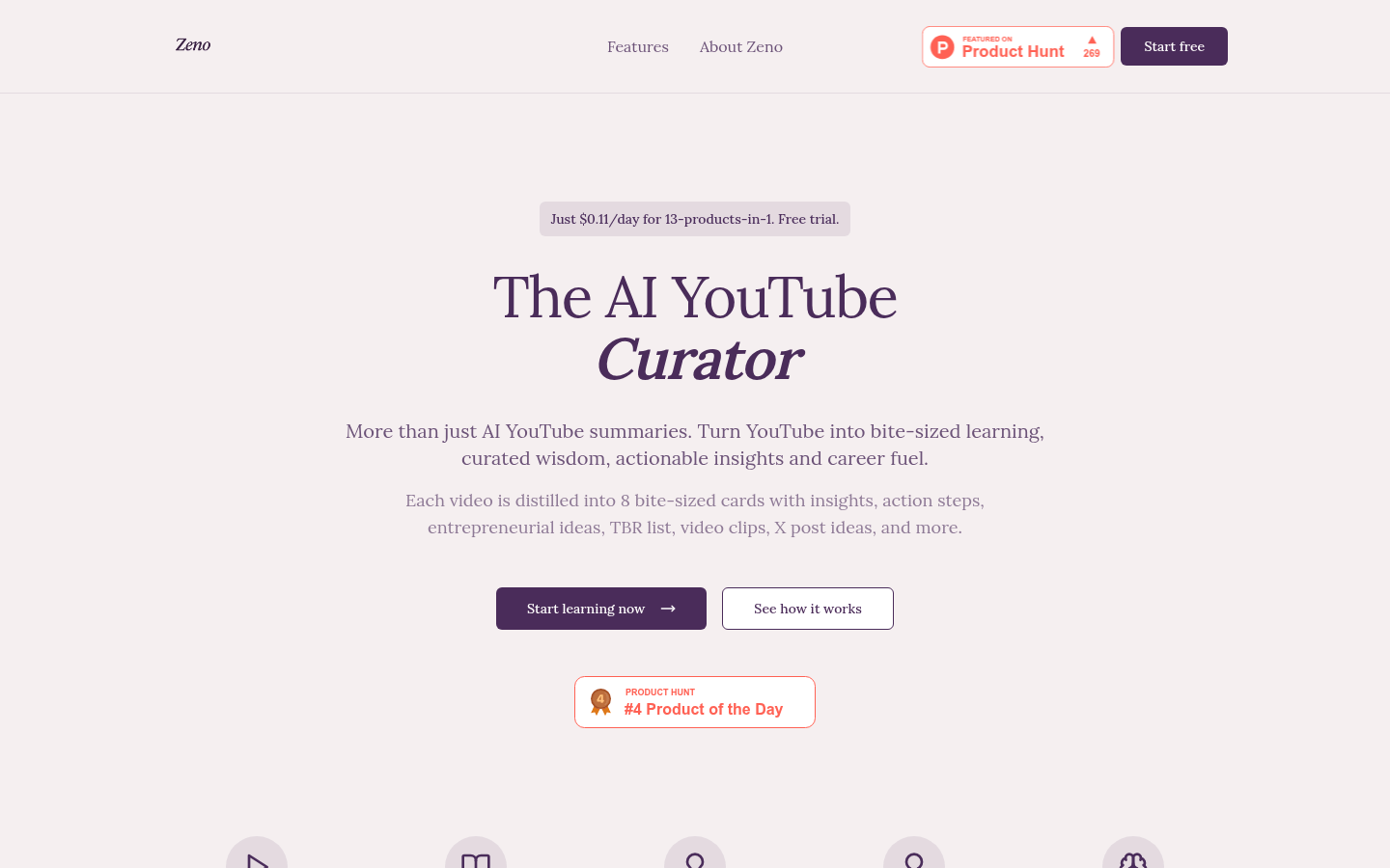 Zeno is an AI YouTube video summarizer designed to boost learning efficiency. It converts lengthy videos into 8 digestible learning cards, providing curated content and actionable insights. Ideal for busy professionals and lifelong learners, it delivers personalized learning paths and business inspiration at an affordable price.